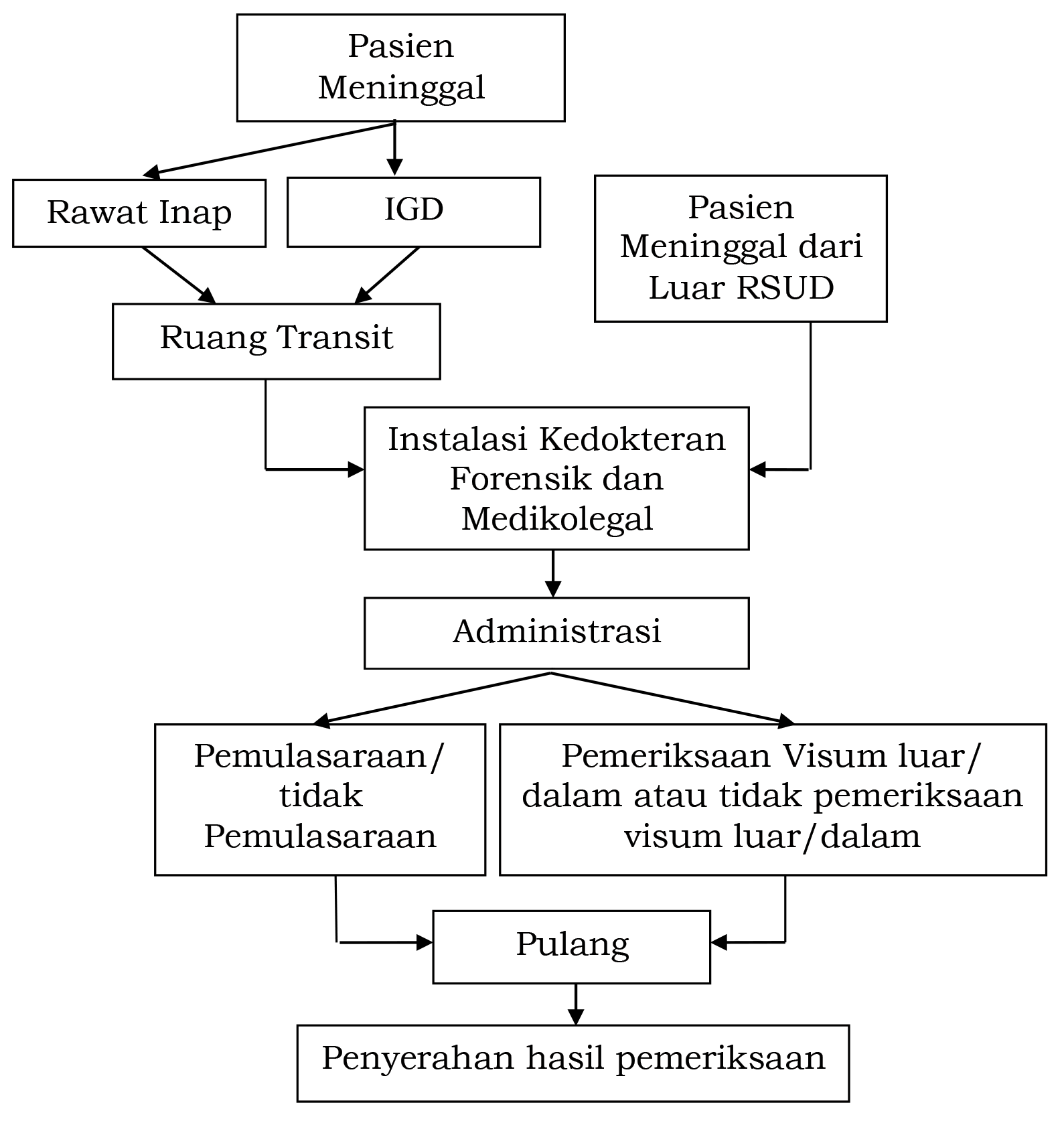 - Jenazah dari Rawat Inap, IGD dan Jenazah dari luar RSUD dibawah ke Instalasi Kedokteran Fornesik dan Medikolegal.